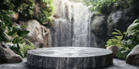 Serene Waterfall Display with a Circular Stone Podium Nestled Amidst Lush Greenery