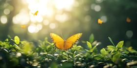 Yellow Butterfly Flitting Through a Sunlit Meadow of Green Foliage