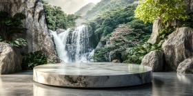 Serene Waterfall Display with a Circular Stone Podium Nestled Amidst Lush Greenery
