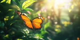 Yellow Butterfly Flitting Through a Sunlit Meadow of Green Foliage