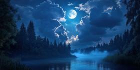 Serene Moonlight Illuminates a Tranquil River Winding Through a Forest of Dark Trees and Snow-Capped Mountains