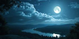 Serene Moonlight Illuminates a Tranquil River Winding Through a Forest of Dark Trees and Snow-Capped Mountains