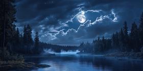 Serene Moonlight Illuminates a Tranquil River Winding Through a Forest of Dark Trees and Snow-Capped Mountains