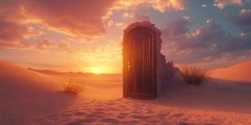 A Wooden Doorway Stands Alone in a Vast Desert Landscape, Beckoning Under a Dramatic Sunset Sky
