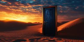 A Wooden Doorway Stands Alone in a Vast Desert Landscape, Beckoning Under a Dramatic Sunset Sky