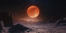 Blood Moon Rising Over a Desolate Alien Landscape, Casting an Eerie Glow on a Rocky Terrain