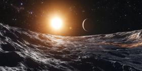 Blood Moon Rising Over a Desolate Alien Landscape, Casting an Eerie Glow on a Rocky Terrain