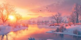 Winter Twilight over a Tranquil River, with Birds Flying Silhouetted Against a Vibrant Sunset Sky