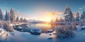 Winter Twilight over a Tranquil River, with Birds Flying Silhouetted Against a Vibrant Sunset Sky