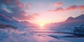 Winter Twilight over a Tranquil River, with Birds Flying Silhouetted Against a Vibrant Sunset Sky