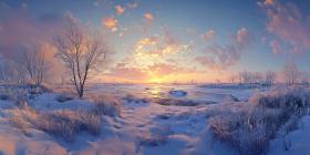 Winter Twilight over a Tranquil River, with Birds Flying Silhouetted Against a Vibrant Sunset Sky