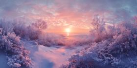 Winter Twilight over a Tranquil River, with Birds Flying Silhouetted Against a Vibrant Sunset Sky
