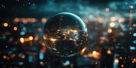 Cityscape Reflected in a Crystal Ball at Dusk, Capturing the Urban Glow and Nighttime Magic
