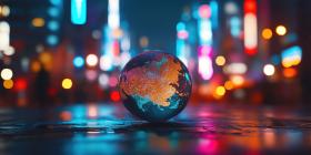 Cityscape Reflected in a Crystal Ball at Dusk, Capturing the Urban Glow and Nighttime Magic