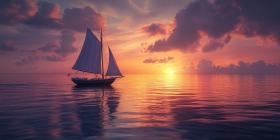 A sailboat glides across the water at sunset, with dramatic pink clouds reflecting on the calm sea.