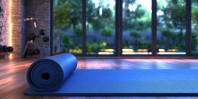 Blue Yoga Mat Unfurling in a Modern Home Gym with Large Windows Overlooking a Lush Green Landscape