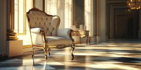 A Luxurious Upholstered Armchair with Gilded Gold Accents Stands Elegantly in a Grand Hallway Bathed in Sunlight.