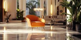 A Luxurious Upholstered Armchair with Gilded Gold Accents Stands Elegantly in a Grand Hallway Bathed in Sunlight.