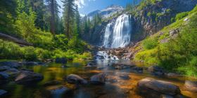 A Majestic Waterfall Cascades Over Mossy Rocks, Bathed in Sunlight, Creating a Breathtaking Natural Scene.