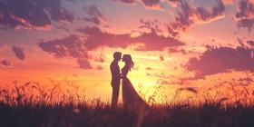 Romantic Couple Standing Close Together by the Edge of a Lake During Sunset, Dressed in Formal Attire with Wedding Dress and Suit