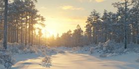 A serene winter landscape with a path winding through a snow-covered forest, illuminated by the warm glow of the rising sun.