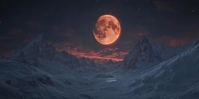 A breathtaking celestial spectacle unfolds as a full moon illuminates a snow-covered mountain landscape against a backdrop of vibrant twilight hues and a starry sky.