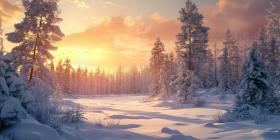 A serene winter landscape with a path winding through a snow-covered forest, illuminated by the warm glow of the rising sun.