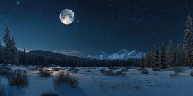 A breathtaking celestial spectacle unfolds as a full moon illuminates a snow-covered mountain landscape against a backdrop of vibrant twilight hues and a starry sky.