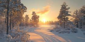 A serene winter landscape with a path winding through a snow-covered forest, illuminated by the warm glow of the rising sun.