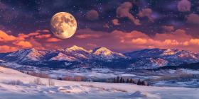 A breathtaking celestial spectacle unfolds as a full moon illuminates a snow-covered mountain landscape against a backdrop of vibrant twilight hues and a starry sky.