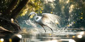 A White Egret Stalking Prey in Shallow Water, Wings Ruffled as it Chases a Fish, Creating a Dynamic Splash of Water