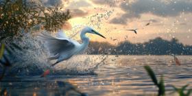A White Egret Stalking Prey in Shallow Water, Wings Ruffled as it Chases a Fish, Creating a Dynamic Splash of Water