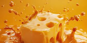 A Cheesy Explosion - A Cube of Cheddar Cheese Crashes into a Pool of Melted Cheese, Creating a Whimsical Splash of Golden Goodness
