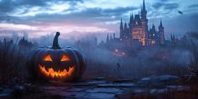 A Jack-o'-Lantern Glows Eerily in the Foreground of a Spooky Halloween Scene, with a Foggy Castle Looming in the Distance