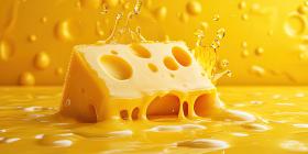 A Cheesy Explosion - A Cube of Cheddar Cheese Crashes into a Pool of Melted Cheese, Creating a Whimsical Splash of Golden Goodness
