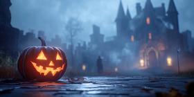 A Jack-o'-Lantern Glows Eerily in the Foreground of a Spooky Halloween Scene, with a Foggy Castle Looming in the Distance