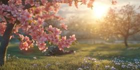 A picturesque scene of a serene lake surrounded by vibrant pink cherry blossoms, with majestic snow-capped mountains in the background and a warm sunset sky casting a golden glow