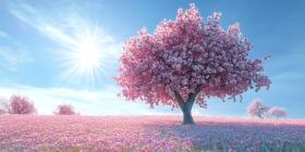 A picturesque scene of a serene lake surrounded by vibrant pink cherry blossoms, with majestic snow-capped mountains in the background and a warm sunset sky casting a golden glow