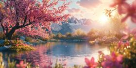 A picturesque scene of a serene lake surrounded by vibrant pink cherry blossoms, with majestic snow-capped mountains in the background and a warm sunset sky casting a golden glow