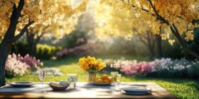 A vibrant bouquet of colorful flowers in a vase, accompanied by a bowl of juicy apricots, adorns a wooden table in a sunlit garden