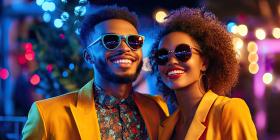 Two Festively Dressed Individuals Celebrating in Glittery Outfits with Black and Red Hats against a Red Background Adorned with Colorful Confetti