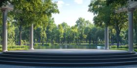 A Wooden Stage with Professional Lighting and Sound Equipment Stands Ready in a Lush Green Park, Awaiting an Audience