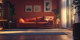Cozy Living Room bathed in Warm and Cool LED Lighting, creating a Serene Ambiance with Plush Sofa, Plants, and a Coffee Table