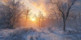 A picturesque winter scene with a sunlit path winding through a snow-covered forest, bathed in the warm glow of the setting sun