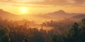 A fiery sunset paints the sky with vibrant hues as the sun dips below a majestic mountain range, casting long shadows across the valley.