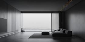 A Gold Wedding Band with a Geometric Pattern Rests on a Plush Black Sofa in a Modern Living Room, with a Cityscape View Beyond the Large Windows.