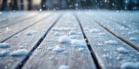 A Wooden Deck Dusted with Snow, With Falling Snowflakes Creating a Magical Winter Scene