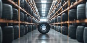 Endless Rows of Tires Lined Up on Shelves in a Well-Lit Warehouse, Creating a Tire-somely Impressive Visual.