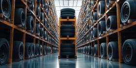 Endless Rows of Tires Lined Up on Shelves in a Well-Lit Warehouse, Creating a Tire-somely Impressive Visual.