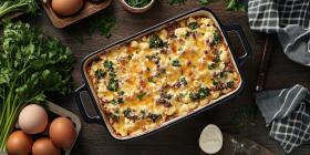 A top-down view of a rustic kitchen scene with a golden-brown cauliflower gratin in a cast iron skillet, surrounded by fresh ingredients like tomatoes, eggs, and herbs.